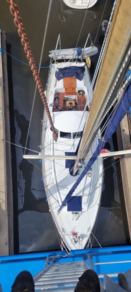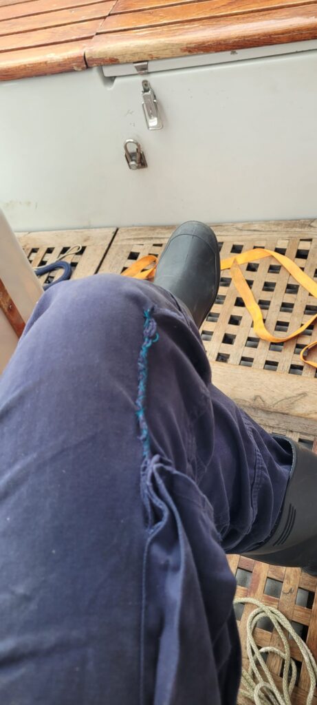 Na een gezellig familiefeest bracht Joke me zondag naar Woudsend. De boot is afgeladen met proviand. Mijn voornemen om zoveel als mogelijk de wind de bestemming te laten bepalen betekent dat ik niet, als gewoon, vertrek vanuit Den Helder. Vandaag zeilde ik heerlijk over IJsselmeer en Waddenzee naar Harlingen. Morgenochtend met hoog water wil ik vertrekken. Een solozeiler moet van alle markten thuis zijn. Van de week hing ik nog boven in de mast (foto), vandaag moest ik onder het zeilen even snel een scheur in de broek repareren (foto). Zit vast. Ik doe het later wel even netjes over